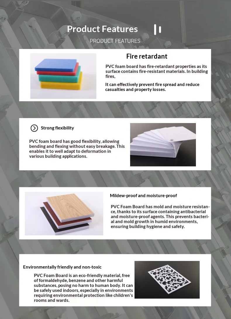 Fireproof Material: Ensures safety and durability in various applications. High Density Foam Board: Provides robust structure and lightweight design. Customizable Processing: Tailored solutions for diverse needs. Multiple Uses: Ideal for bathroom, advertising, and home decoration.